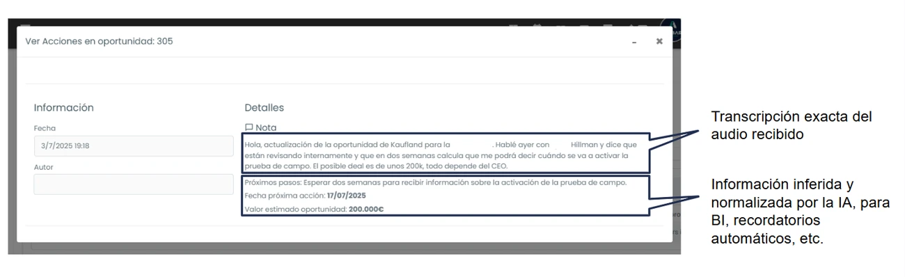 Para la empresa, el beneficio es aún mayor. Se consigue un CRM siempre actualizado, con datos más ricos y fiables. Esto permite a marketing segmentar mejor las campañas, al servicio de soporte conocer el histórico de cada cliente y a dirección tomar decisiones con una visión 360 de la actividad comercial. En otras palabras: se convierte un hábito cotidiano (enviar un audio por WhatsApp) en un flujo de información que beneficia a todo el negocio.